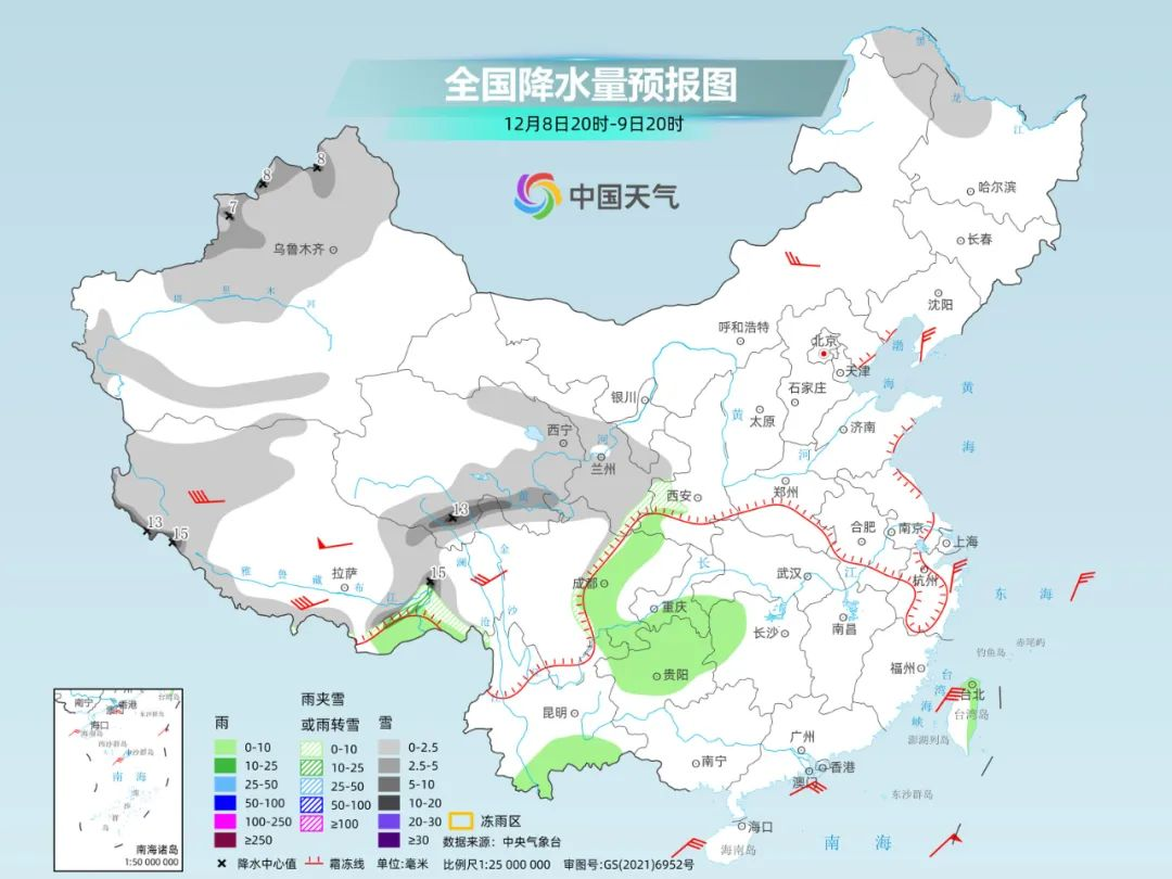 冷空气还会给北方部分地区带来期盼已久的初雪。9日,降雪将出现在新疆北部、青海东部和南部、甘肃南部等地,局地或现暴雪。