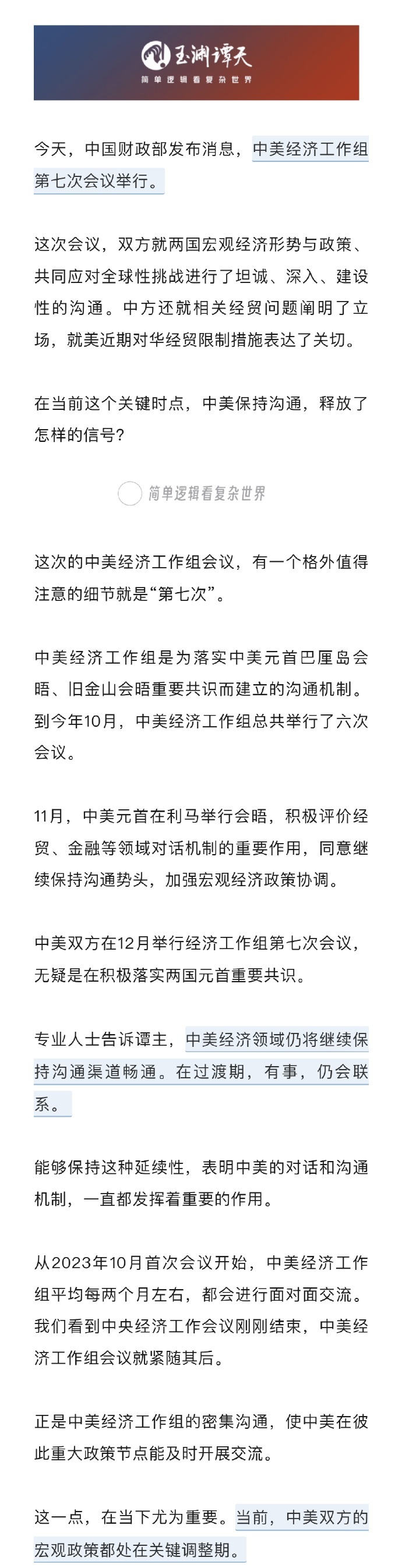 中美经济工作组第七次会议近日在南非约翰内斯堡召开。这次会议,是中国财政部副部长廖岷与美国副财长尚博在二十国集团财政和央行副手会期间共同主持召开的。当前,中美宏观政策处于关键调整期,美方也处于政府换届的过渡期,在这样的关键时刻,中美再沟通,释放了重要信号。专业人士告诉谭主,中美经济领域仍将继续保持沟通渠道畅通。在过渡期,有事,仍会联系。中美双方谈了什么,一起来看谭主解读。