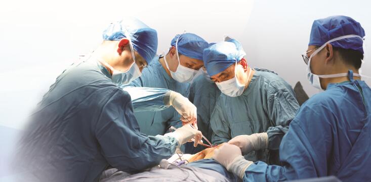 图⑥:海军军医大学长海医院关节骨病外科教授徐卫东(右二)指导永顺县中医院医护人员开展第一例关节镜下前交叉韧带重建手术。马天峰摄