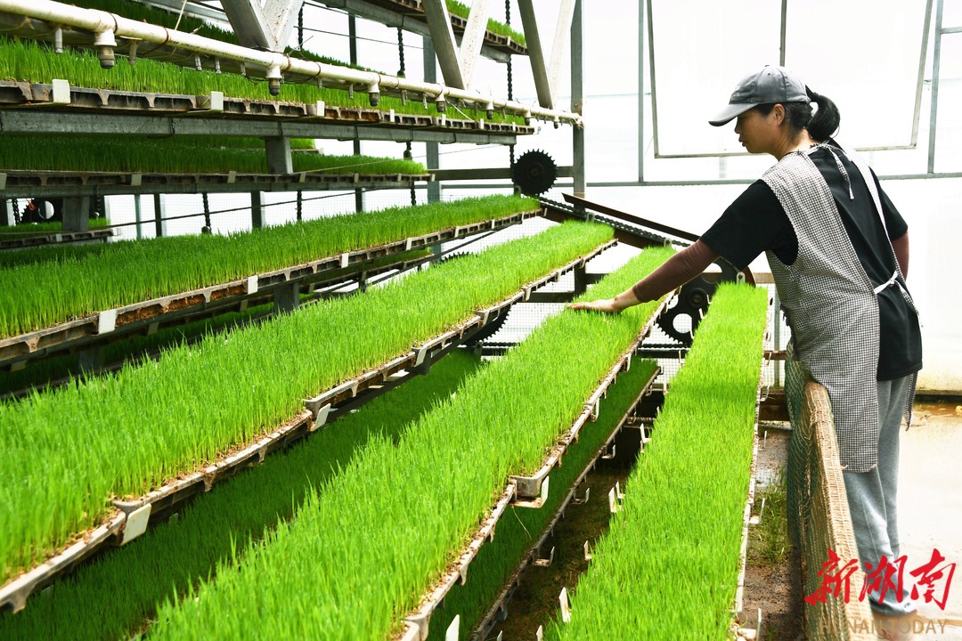 2024年4月19日,江永县潇浦镇接龙桥村工厂化育秧中心,村民在查看第三批早稻秧苗长势。 田如瑞 摄(湖南图片库)
