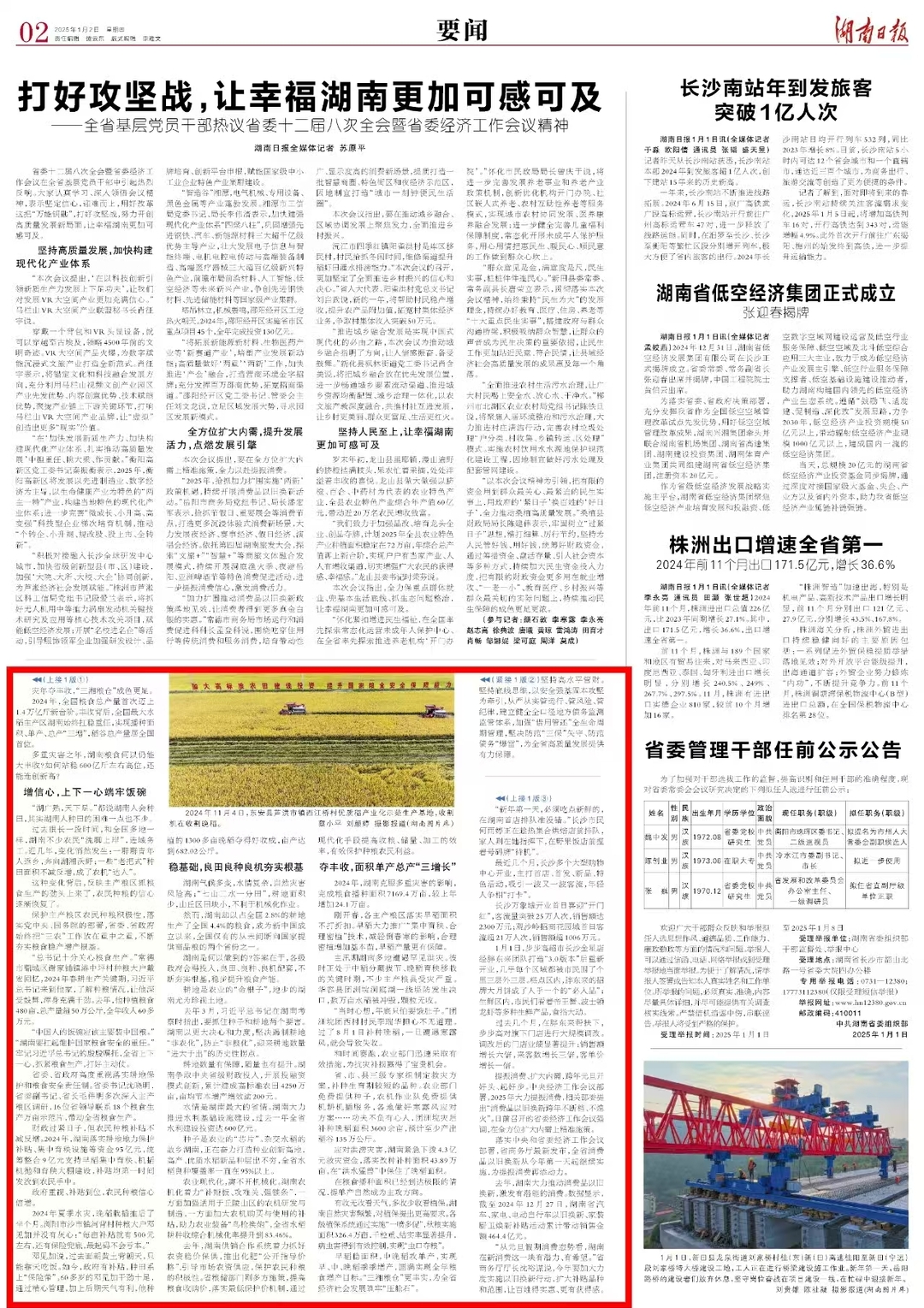 早稻稳面积,中晚稻攻单产,实现早、中、晚稻季季增产,圆满实现全年粮食增产目标。“三湘粮仓”更丰实,为全省经济社会发展筑牢“压舱石”。