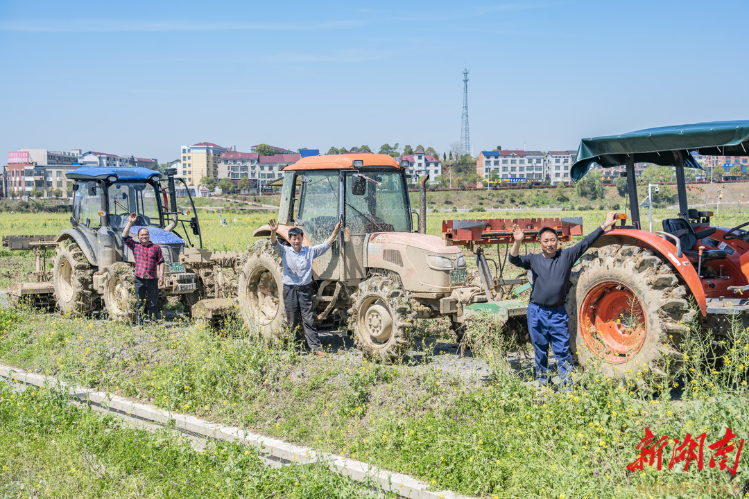 2024年3月29日,浏阳市沙市镇河背村,种粮大户邓见加(右)、暨东方(中)、邓红灿在一起合影。 湖南日报全媒体记者 李健 摄