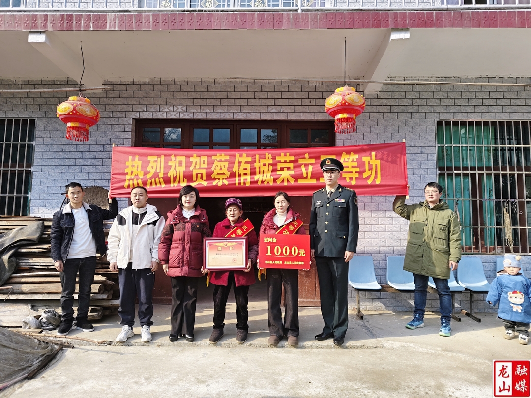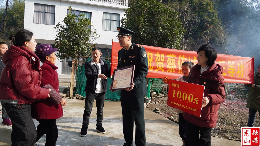 龙山县融媒体中心1月10日讯(记者 马菲)1月10日,伴随着噼里啪啦的鞭炮声,一场温馨且庄重的立功送喜报活动在召市镇贾坝社区热闹开场,县退役军人事务局联合中国人民解放军驻吉林某部队和召市镇人武部一行来到荣立三等功的现役军人蔡侑城家中,为其家人送去立功喜报和奖励金,向他们表示祝贺和感谢。