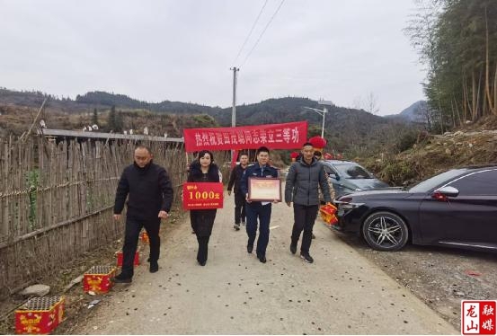 龙山县融媒体中心2月7日讯(通讯员 王平田顺勇 向祖勋)2月7日,蛇年瑞气盈门喜,春日祥光满院福,中国人民解放军空军某部队联合龙山县退役军人事务局、苗儿滩镇政府一行来到苗儿滩镇八吉村,为荣立三等功的现役军人田茂聪家庭送去立功喜报和慰问金,让新婚的军属共享这份荣誉,小小的院坝里,满是欢声笑语与温情敬意,邻居们的夸赞声此起彼伏,活动现场,喜庆洋溢,锣鼓喧天、鞭炮齐鸣。
