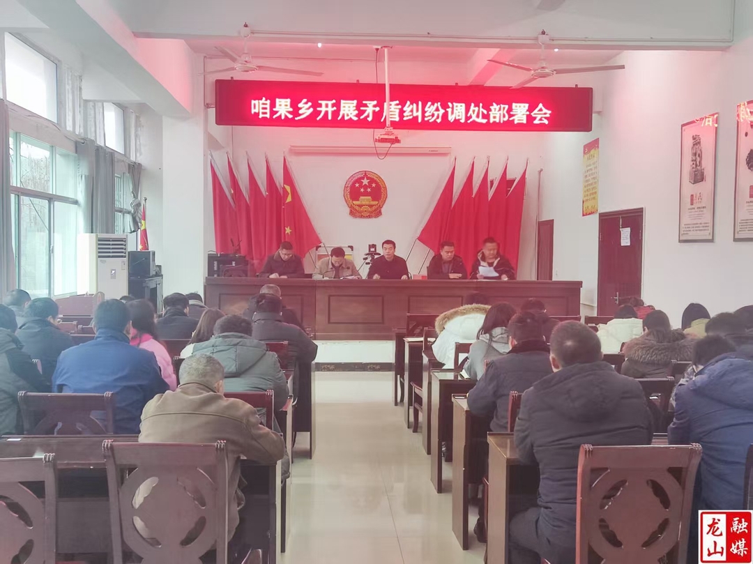 龙山县融媒体中心2月21日讯(通讯员  谭中杰)2月21日,咱果乡开展矛盾纠纷调处工作部署会,就当前矛盾风险源头管控、矛盾隐患排查处置、矛盾纠纷化解等工作进行安排部署,全体在家干部、村干部、村辅警等参加会议。