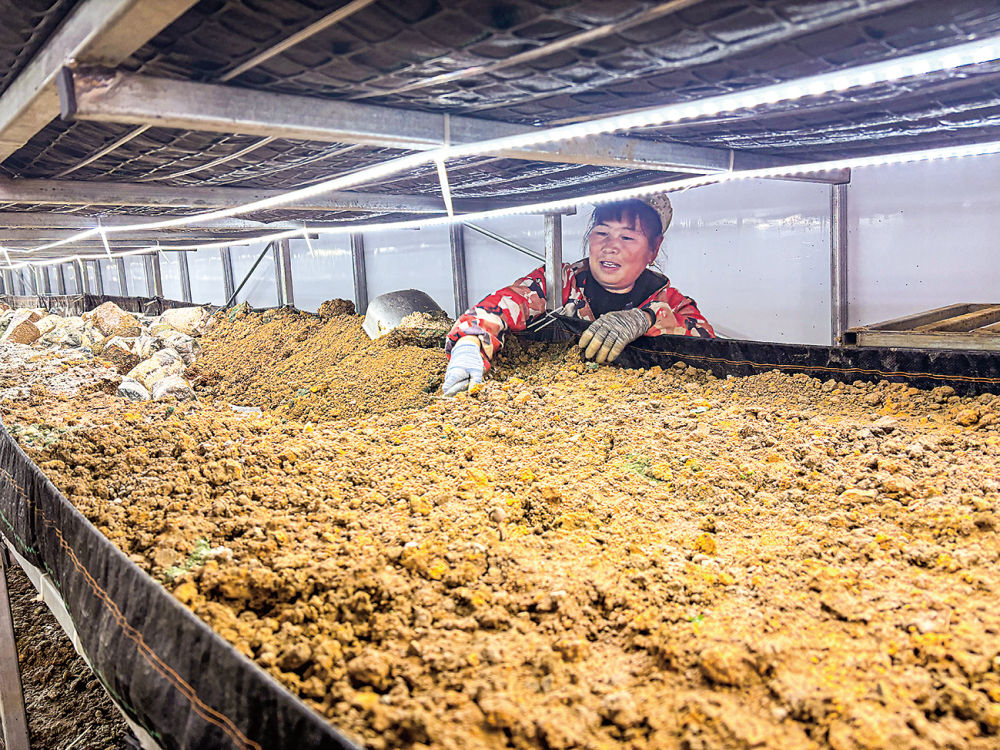 村民在吉首市勤丰村食用菌种植基地工作的场景。新华每日电讯记者余春生 摄