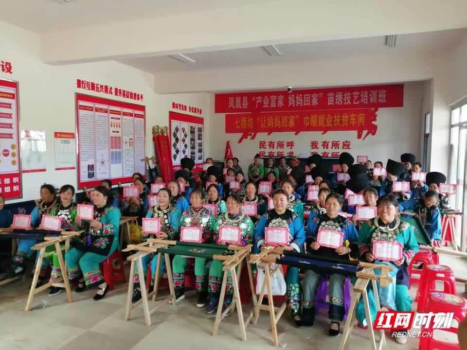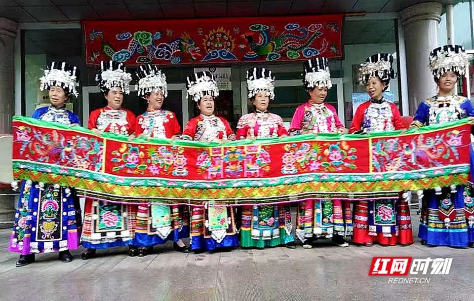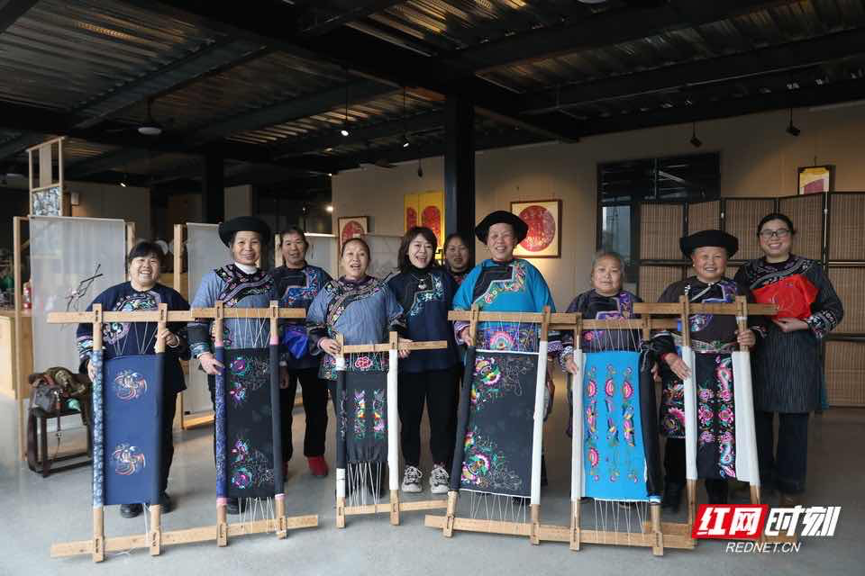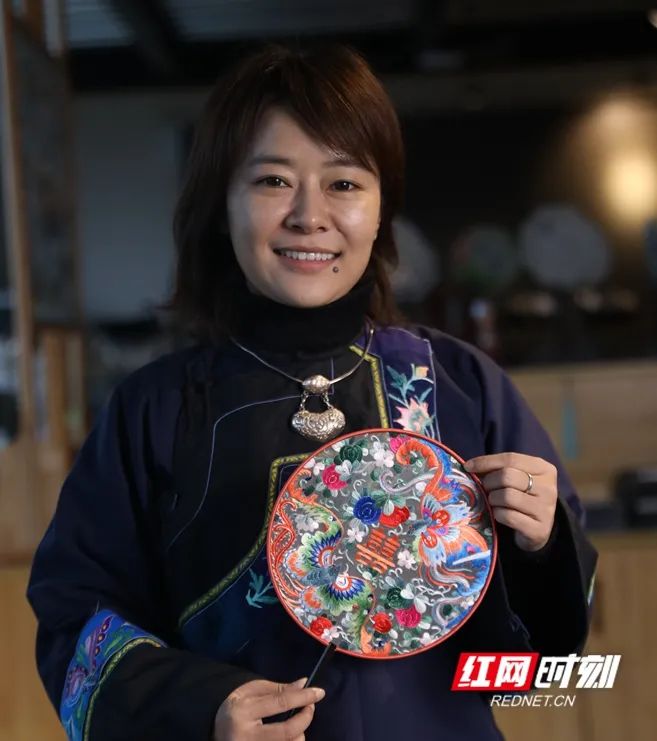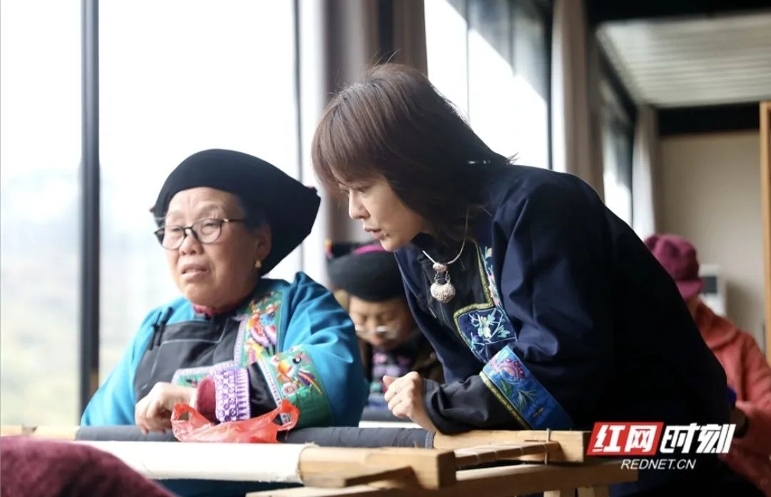 伴随一场春雨,观潮君一路从长沙驱车近6个小时,抵达湘西州花垣县石栏镇。在这里,观潮君听到了两句顺口溜,一句是“带着娃、绣着花,养活自己又养家”,另一句是“忙时采茶,闲时绣花,照顾孩子养活家”。这两句顺口溜,都与同一个人密切相关——全国人大代表、湘西七绣坊苗服饰文化有限公司(以下简称“七绣坊”)董事长石佳。▲全国人大代表石佳(右)和绣娘。(除另有标注外,图片均由秦楼、龚子杰拍摄)在石栏镇,“85后”石佳的名气不小,十里八乡都知道她有能耐。
