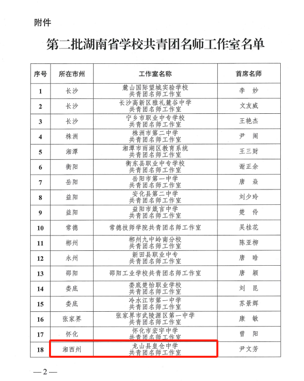 龙山县融媒体中心3月11日讯(通讯员 徐小兰 龙永忠)根据《关于开展第二批湖南省学校共青团名师工作室建设暨建立区域性中学(职)共青团工作联盟的通知》,龙山县“皇仓中学共青团名师工作室”成功入选第二批湖南省学校共青团名师工作室。