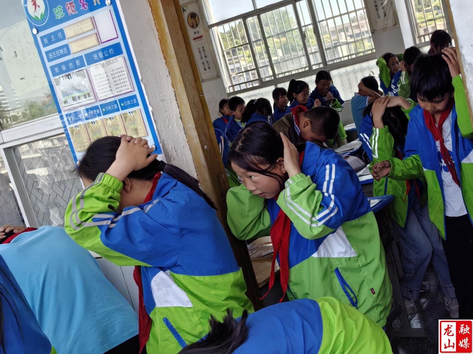 演练开始,总指挥通过广播宣告演练正式开始。“地震警报”信号响起,教室内师生迅速反应,授课教师立即组织学生就地避险,指导学生抱头、闭眼,躲在课桌下或旁边,蜷曲身体降低重心,用书包护头,最后一排同学蹲在墙角处,演练时长4分35秒。警报解除后,“紧急疏散”信号发出,教师迅速打开教室门,带领学生按预定路线有序撤离。学生听从指挥,动作敏捷规范,沿指定线路疏散,无串线、推拉、冲撞等情况。