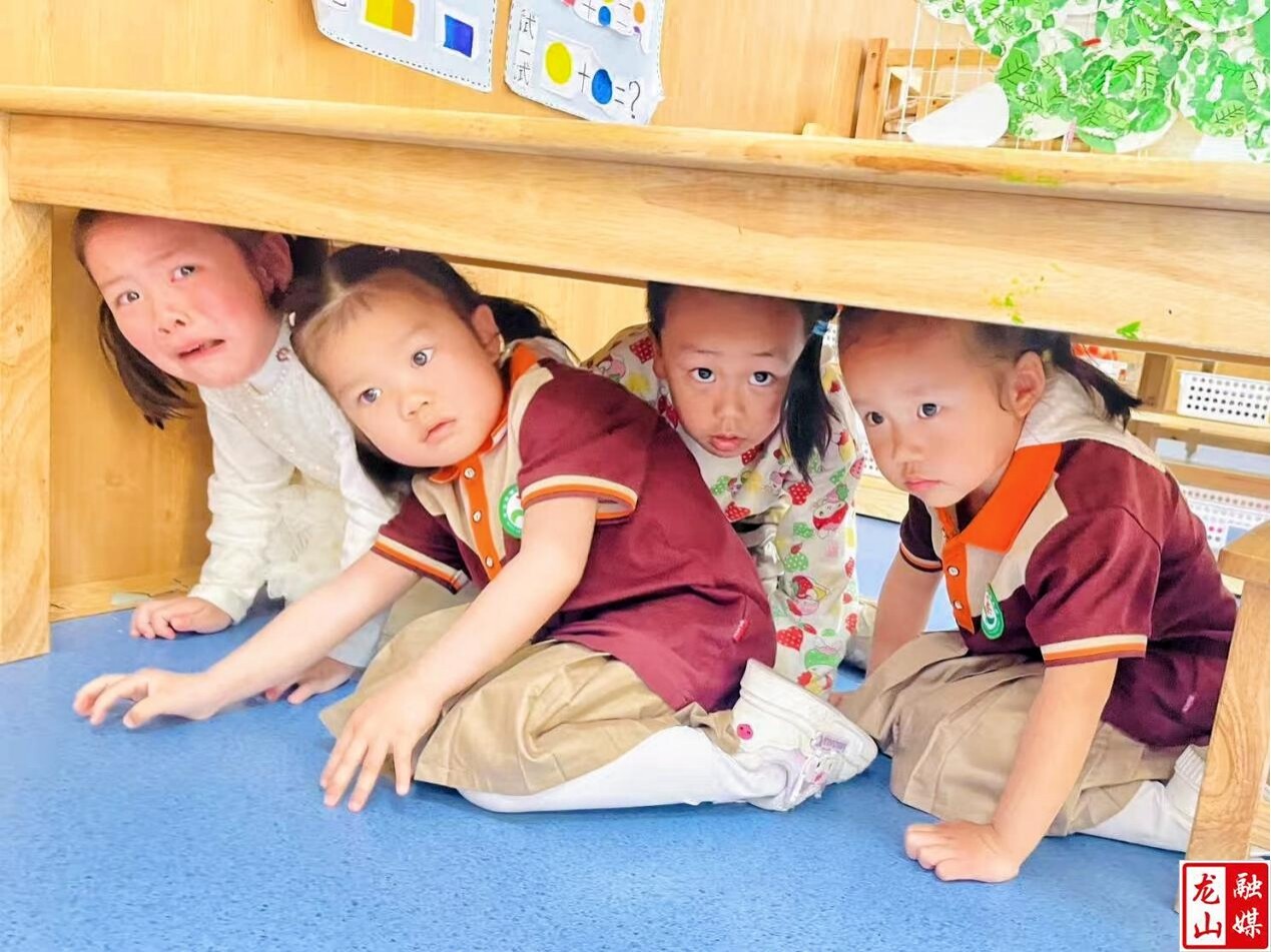 该园师幼迅速反应,孩子们在老师的指导下,迅速躲到课桌下或靠近墙脚等相对安全的地方,用书包、枕头等物品保护头部,并尽量蜷缩身体、降低重心以减小伤害。