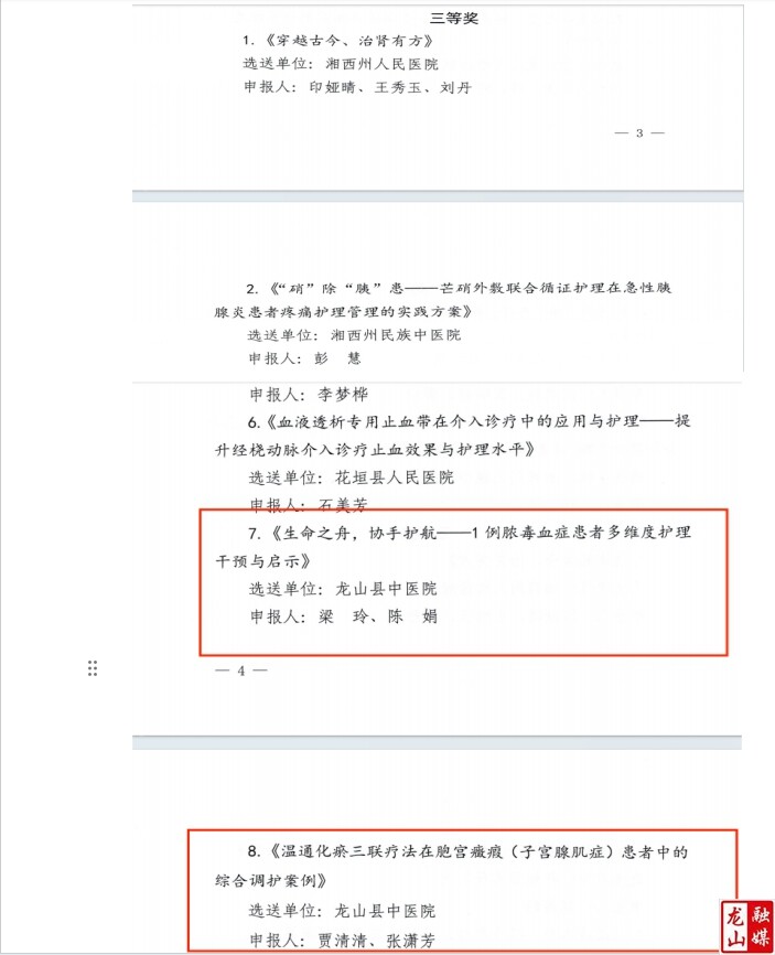 龙山县融媒体中心5月14日讯(通讯员  张桃)近日,湘西自治州首届护理精品案例评选活动圆满落幕,龙山县中医院选送的《1 例脓毒血症患者多维度护理干预与启示》《温通化瘀三联疗法在胞宫癥瘕(子宫腺肌症)患者中的综合调护案例》凭借创新的护理理念、科学的干预措施和显著的临床效果,双双荣获“护理精品案例”三等奖称号!这一荣誉不仅彰显了该院护理团队的专业实力,也为提升县级医院护理服务质量树立了标杆。
