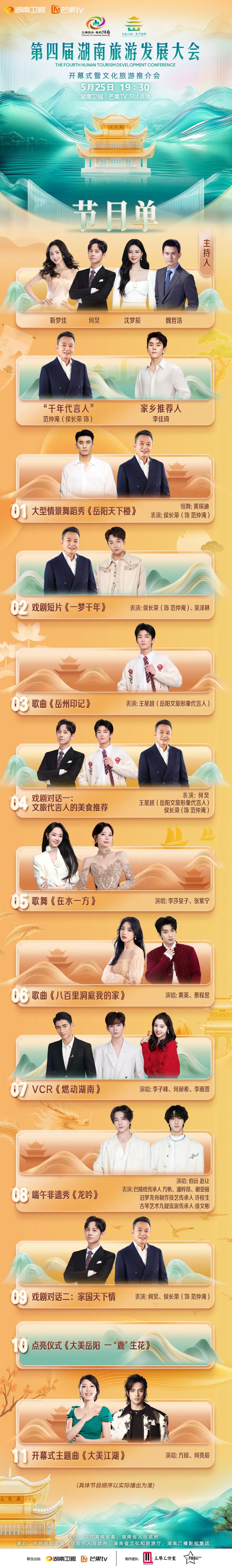 今天19:30,第四届湖南旅游发展大会开幕式暨文化旅游推介会即将启幕!此次大会以“大美江湖·天下岳阳”为主题,艺术与科技相交融,节目类型丰富多样,包括歌曲、舞蹈、戏剧、非遗实景秀等,力争打造一台文化感、科技感十足的文旅推介会,开幕式由中共湖南省委、湖南省人民政府主办,中共岳阳市委、岳阳市人民政府、湖南省文化和旅游厅、湖南广播影视集团承办、湖南卫视王琴工作室和罗新星团队联合打造,通过湖南卫视、芒果TV双平台直播。何炅、魏哲浩、沈梦辰、靳梦佳担任开幕式主持人,李佳琦将作为家乡推荐人惊喜现身。