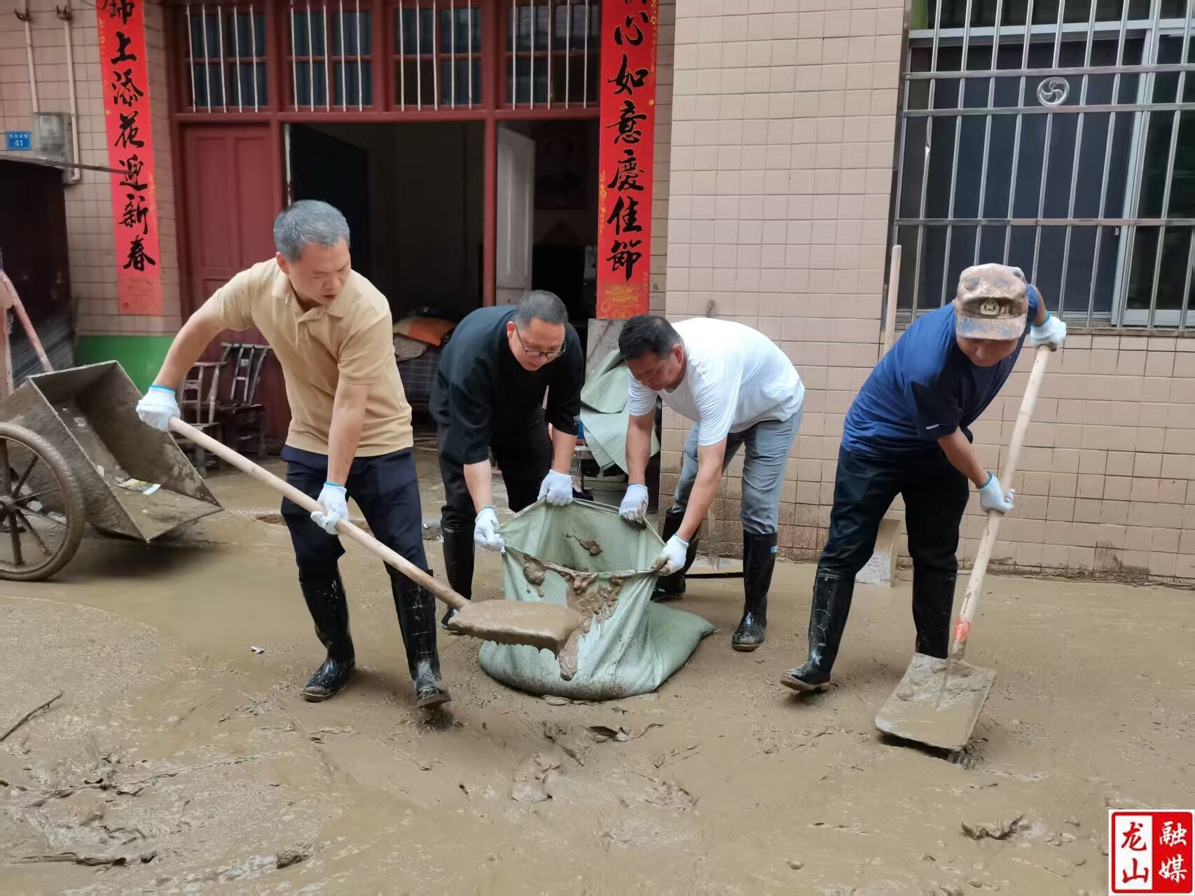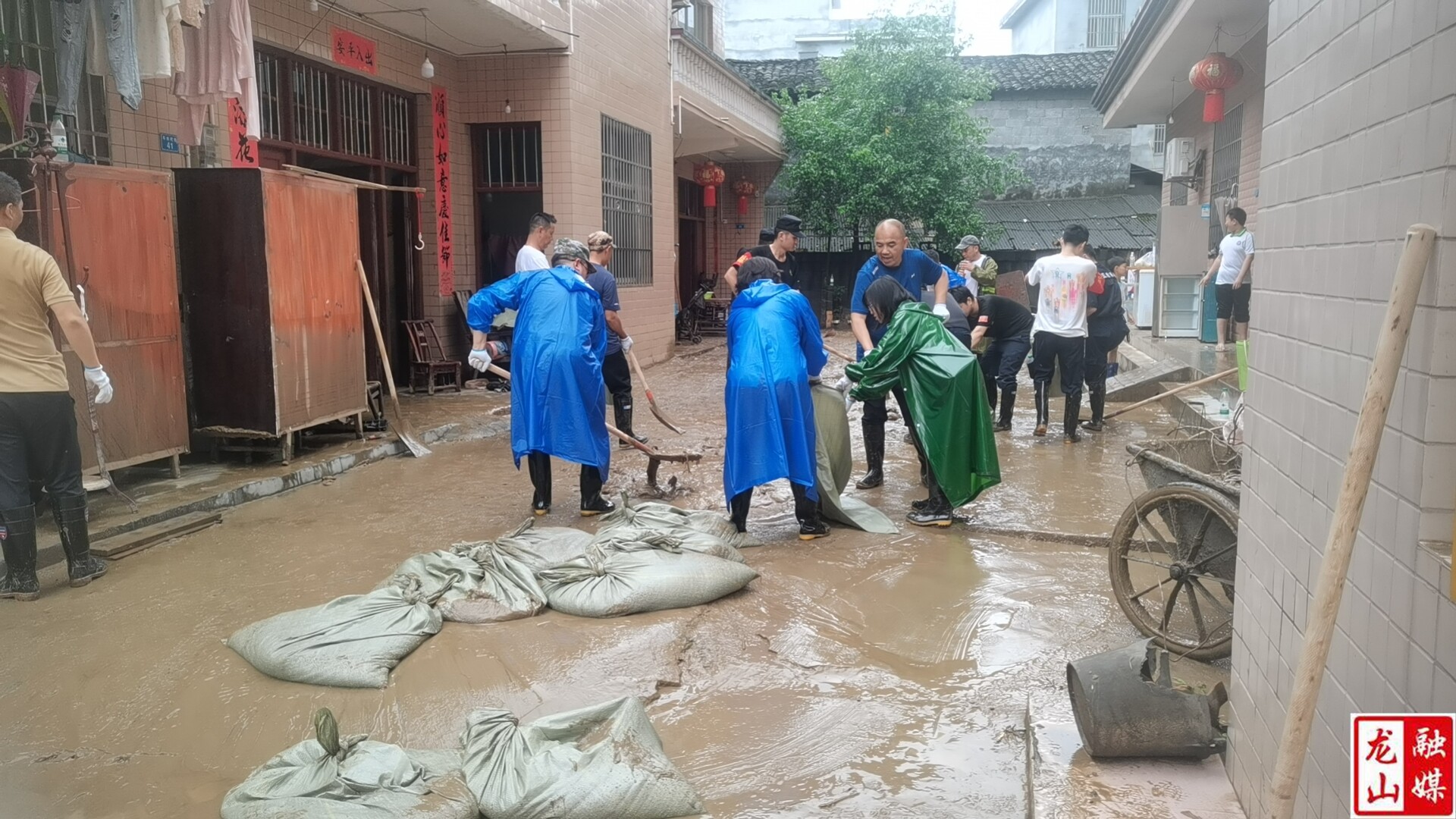 县退役军人事务局党员干部为兴隆街道车水坨巷子受灾群众清理淤泥