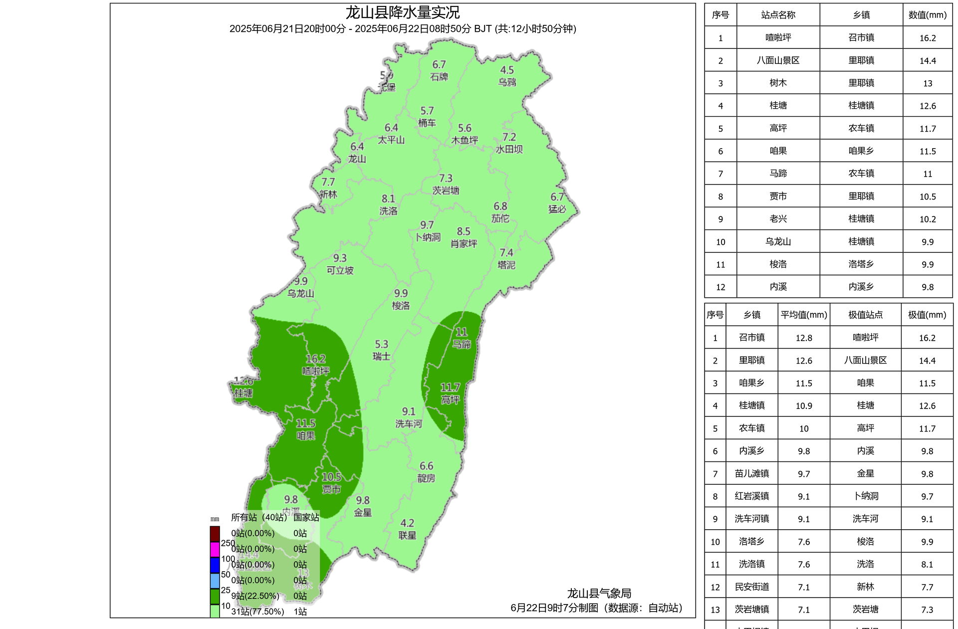 6月21日20时至22日08时50分我县降小到中雨。全县平均雨量为8.4毫米,最大降水为召市镇喳啦坪站16.2毫米,最小降水为靛房镇联星站4.2毫米。