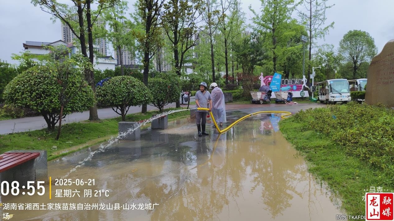 6月19日下午,洪水消退后,公司组织员工进行灾情查看,在县水利局的指导下进行生产自救,形成“机械清淤+人工细化+即时冲洗+即时消杀+积极修复”的五步作业链。一边用铲车、洒水车等大型机械设备,对绿道、中秋坝广场等淤泥堆积较厚区域进行集中铲除和冲洗,利用洒水车+人工进行反复冲洗,将泥沙和杂物彻底清除,员工们身着雨衣,脚踩泥泞,手持铁铲等工具配合作业,在县疾病预防控制中心的指导下对清理出来的绿道、广场进行消杀防疫。