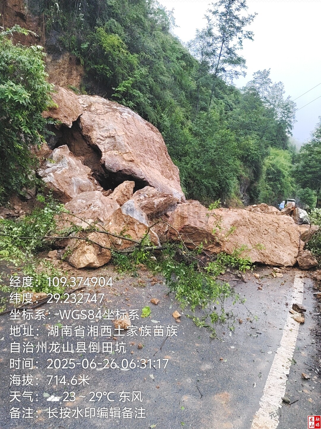 龙山县融媒体中心6月26日讯(记者 莫代银 朱勇 杜倩 )受持续强降雨影响,6月26日,龙山县辖区省道s309火岩至召市干线公路发生塌方,路段一度交通中断。公路、召市镇等部门紧急抢修,确保道路恢复畅通。