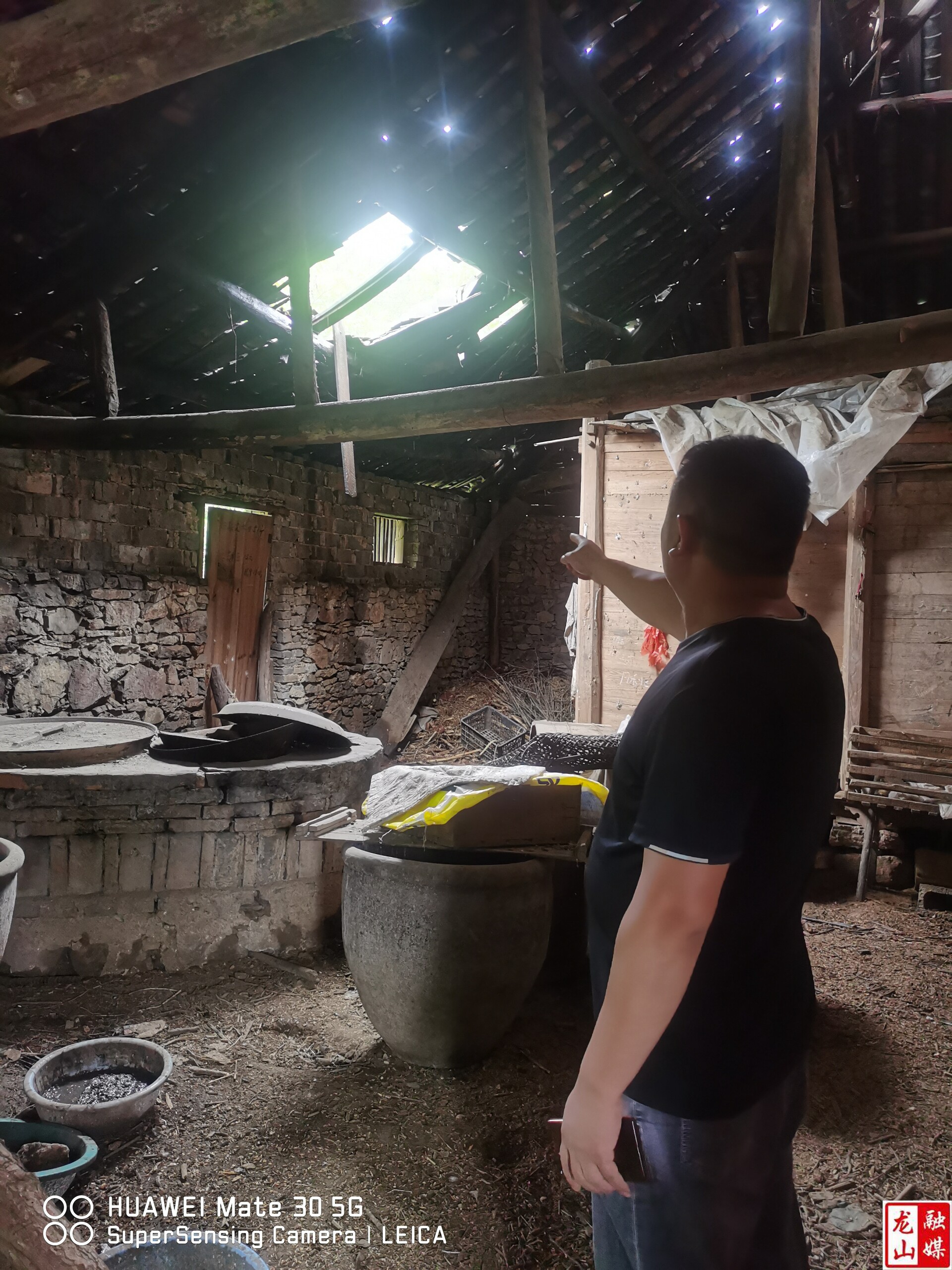 按照排查路线,一行人沿着主公路来到该村 8 组周元明家。这是一栋年久失修的老式木房,多处瓦片因大雨冲刷移位,雨水渗入导致木制房梁、扣板等部位浸烂。持续大雨下,部分房梁因承重不足断裂,引发大面积倒塌,房屋边沿缝隙不断扩大,严重威胁住户生命财产安全。驻村第一书记现场联系户主三个儿子、村干部及乡镇分管危房和应急工作的工作人员,详细说明房屋部分垮塌、墙梁歪斜、漏雨、瓦片掉落等受损情况,指出需尽快整修或上报。经沟通,工作人员迅速拍摄远近照片、填写房屋受损情况表,下一步将由应急部门入户核实、鉴定受损级别并部署整修。随后,排查人员前往另一户,发现破旧烤烟房出现掉瓦、断梁问题,且紧邻公路,工作人员督促户主尽快推倒,以保障周边行人安全。