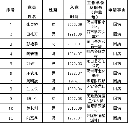 按照《龙山县“双维”帮扶基金管理办法(试行)》的有关规定,经党员个人申请、党支部初审、党委(党工委、党总支)审核、县党务服务中心调查、县委组织部部务会研究,拟对张灵娇等11名申请对象进行救助,现将有关情况予以公示。
