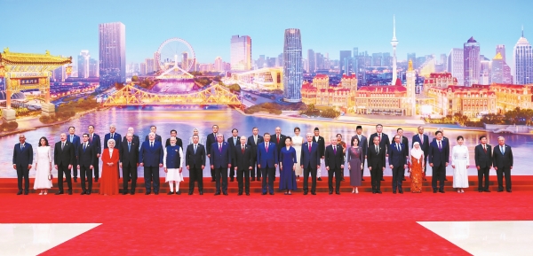 8月31日晚,国家主席习近平和夫人彭丽媛在天津梅江会展中心举行宴会,欢迎来华出席2025年上海合作组织峰会的国际贵宾。这是宴会前,习近平和彭丽媛同贵宾们集体合影留念。新华社 发