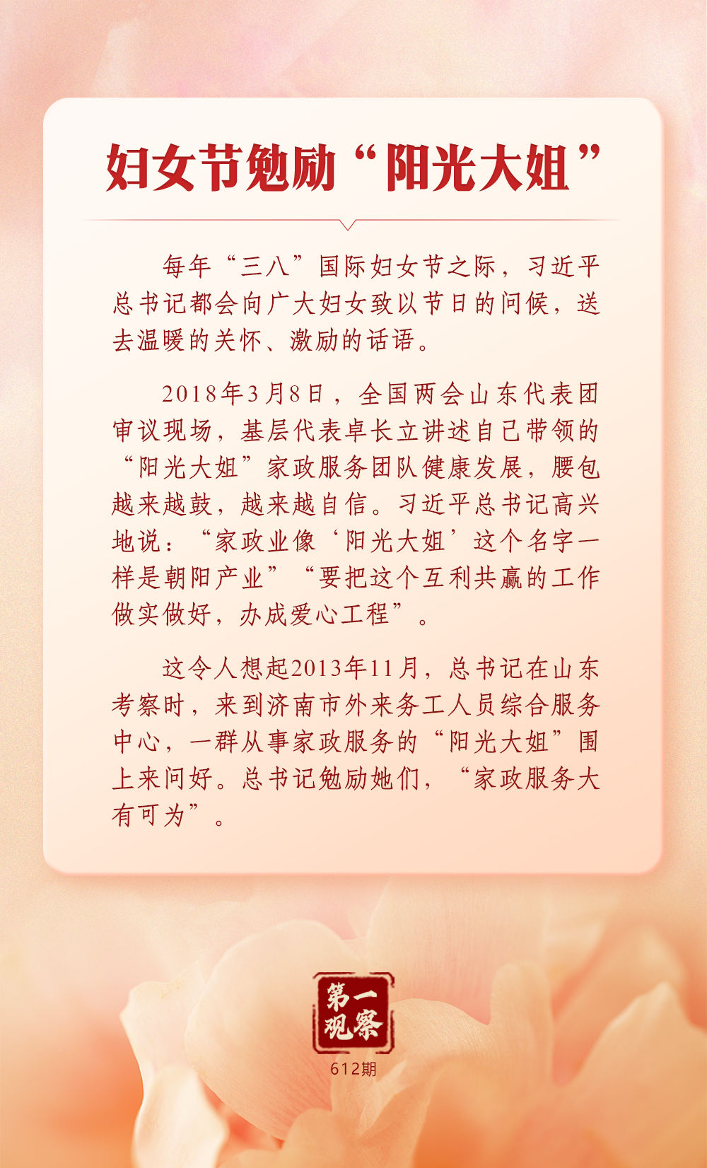 习近平总书记始终心系妇女事业发展。在全球妇女峰会即将召开之际,让我们一道深刻体悟这份一以贯之的牵挂与重视。
