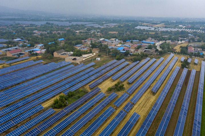 2025年6月25日在山西省运城市芮城县夭上村拍摄的光伏基地(无人机照片)。新华社记者 杨晨光 摄