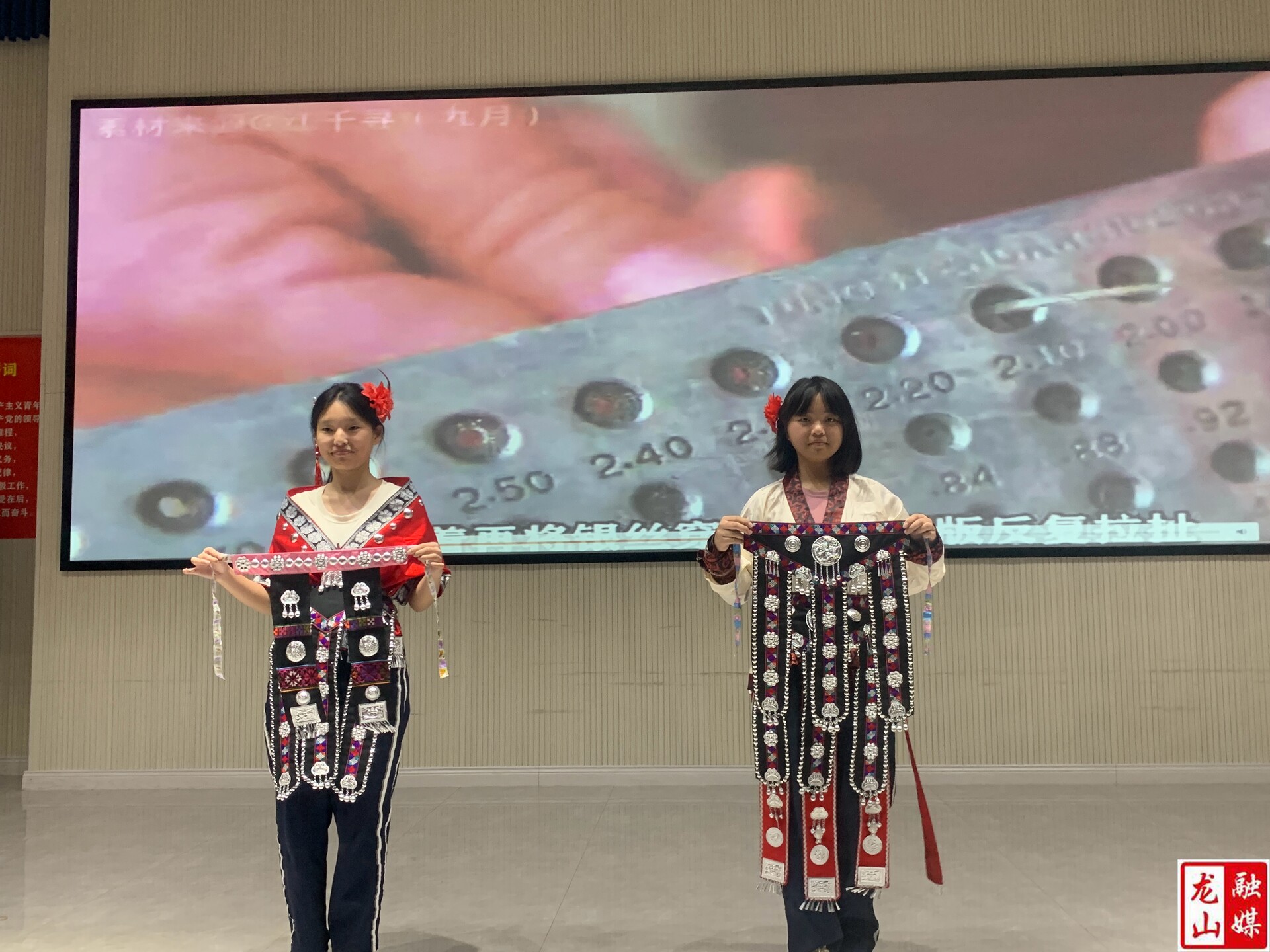 民俗文化展示中,同学们展示了自己制作的苗族银饰手工品,精美细腻,实现民族工艺在课堂上、指尖上的传承。此外,学生代表还讲解土家族织锦“西兰卡普”编织技艺,讲述图案中所融合的传统纹样、自然意象、神话传说。