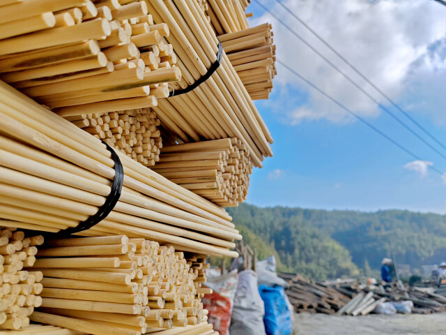 (桂东县沤江镇马坊村楠竹加工厂,村民忙着加工楠竹。邓仁湘 摄)