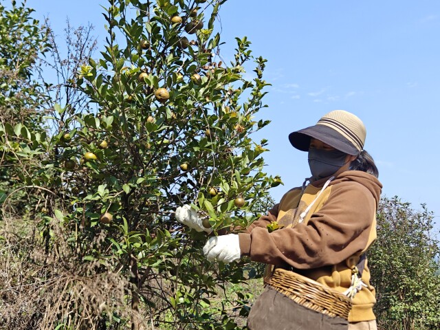 (古丈县火麻村油茶基地迎来丰收,村民在采摘茶果。湖南日报全媒体记者 杨元崇 摄)