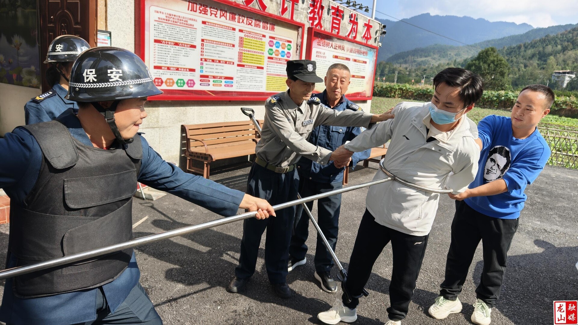 演练模拟“可疑人员”试图闯入校园的突发场景:学校安保人员迅速响应,默契配合——一人持防暴钢叉控制“嫌疑人”肢体,其余人员协同将其带离现场,整套处置流程规范高效,展现出良好的应急反应能力。