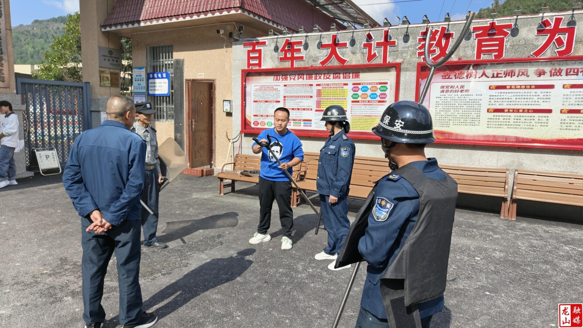龙山县融媒体中心11月4日讯(通讯员 彭枢涛 段波 向孝辉)近日,靛房学校开展反恐防暴应急演练暨安保人员处置培训活动,以实战化演练绷紧校园安全弦。