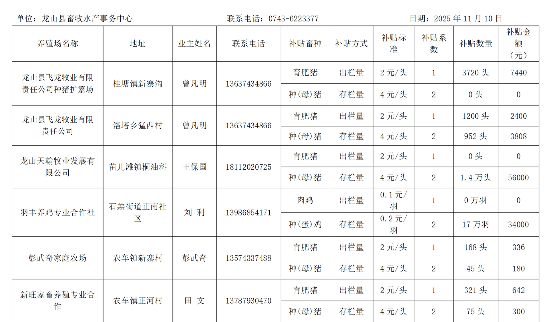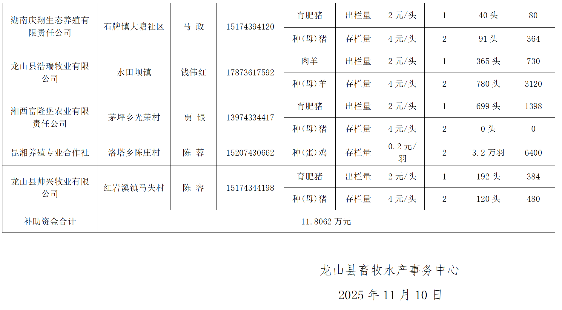 按照《湖南省农业农村厅关于印发<湖南省畜禽强制免疫“先打后补实施方案”>的通知》(湘农发【2024】96号)文件的要求,由养殖场提出申请,经审核,现将我县2025年度规模养殖场畜禽强制免疫“先打后补”补助资金公示如下: