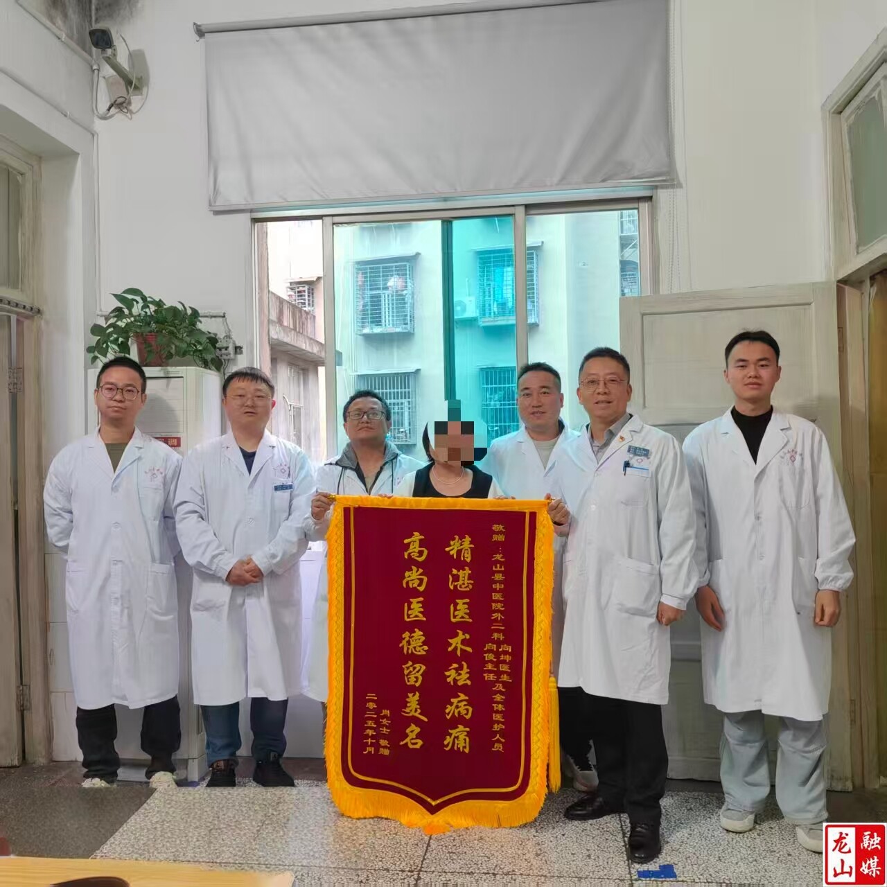 龙山县融媒体中心11月17日讯(通讯员 张桃 向坤)“现在走路膝关节一点都不痛了,行走自如,太感谢你们了,为你们精湛的医术与无微不至的关怀点赞!”近日,在龙山县中医院普外骨伤科,康复出院的肖女士将一面写有“精湛医术祛病痛 高尚医德留美名”的锦旗送到了普外骨伤科医护人员的手中,激动地表达着感激之情。