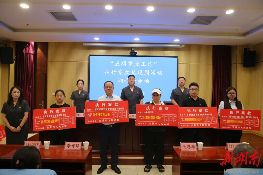 湘西自治州中级人民法院组织湘西州法院开展“‘五项重点工作’执行案款兑现周”活动,现场集中发放执行案款。(湘西自治州中级人民法院 徐杨摄)