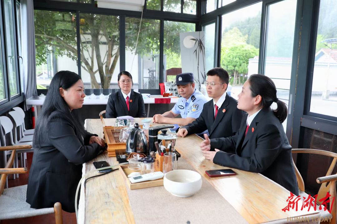 古丈县人民法院干警走进辖区茶企,与茶企负责人面对面交流。(古丈县人民法院 彭霏莹 摄)