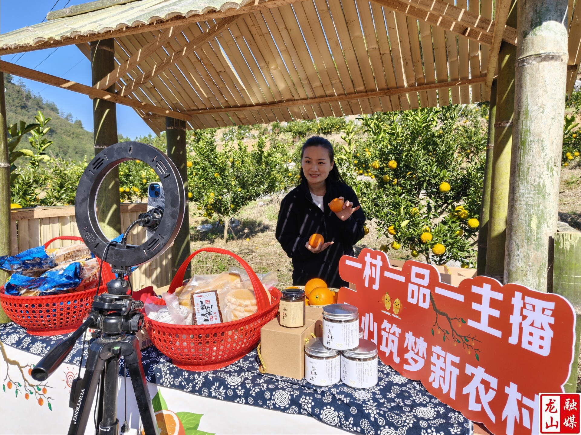 青山环抱,橙香四溢。隆头社区5000余亩柑橘林披金挂黄,爱媛果冻橙、脐橙、黄金贡柚错落有致,预计年产值超400万元,带动村集体经济年增收30万元。3个新阶联助农直播间和1个农商银行助农直播间就搭在果园里,一眼望去,枝头橙果与镜头灯光交相辉映,构成一幅“丰收+流量”的冬日胜景。