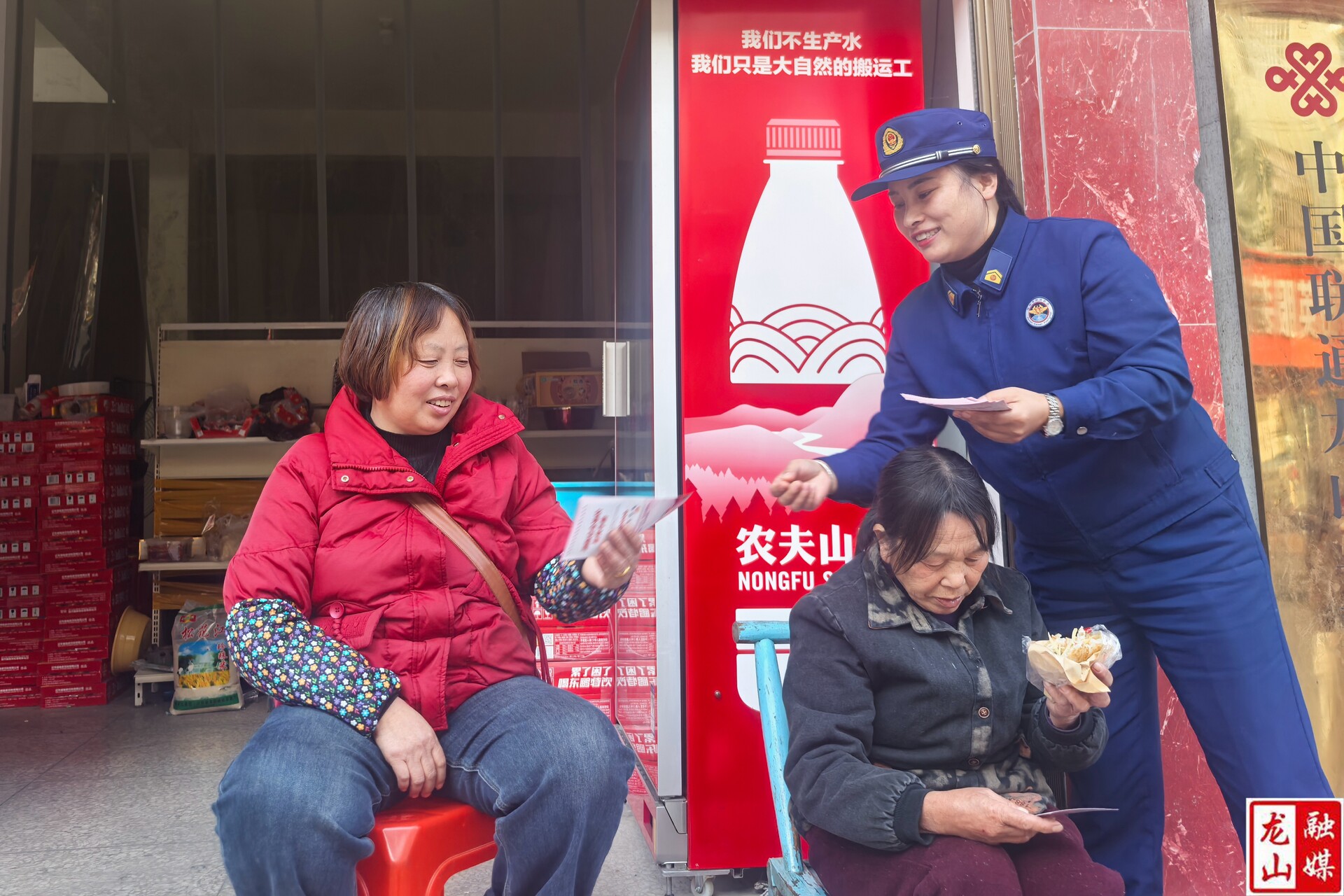 除了现场演示,宣传员们还带着宣传资料穿梭在集市中。他们不发传单发“对联”——印着消防知识的新春对联,每副都用大字写着防火要点。“这个实用,贴门上天天能看见!”猪肉摊主刘大哥接过春联。