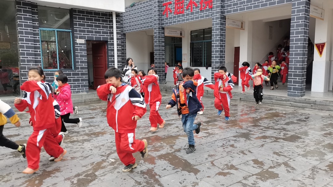 当警报声响起,教师迅速指导学生拿书抱头,身体弯曲就近躲避在课桌下,并保护好头部。10秒强震过后,在教师的指挥下,按制定路线,有序地离开教室,到达户外安全场地。到达操场之后,学生按照要求保持蹲下或坐下的姿势,降低身体重心,并时刻护住头部。各班迅速清点人数。