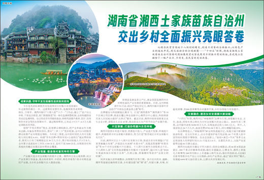 从精准扶贫首倡地十八洞村的蝶变,到连片村寨的全面振兴;从特色产业的遍地开花,到文旅融合的全域破圈……“十四五”时期,湖南省湘西土家族苗族自治州坚持巩固拓展脱贫攻坚成果同乡村振兴有效衔接,在武陵山区描绘了一幅产业兴、乡村美、农民富的美丽画卷。