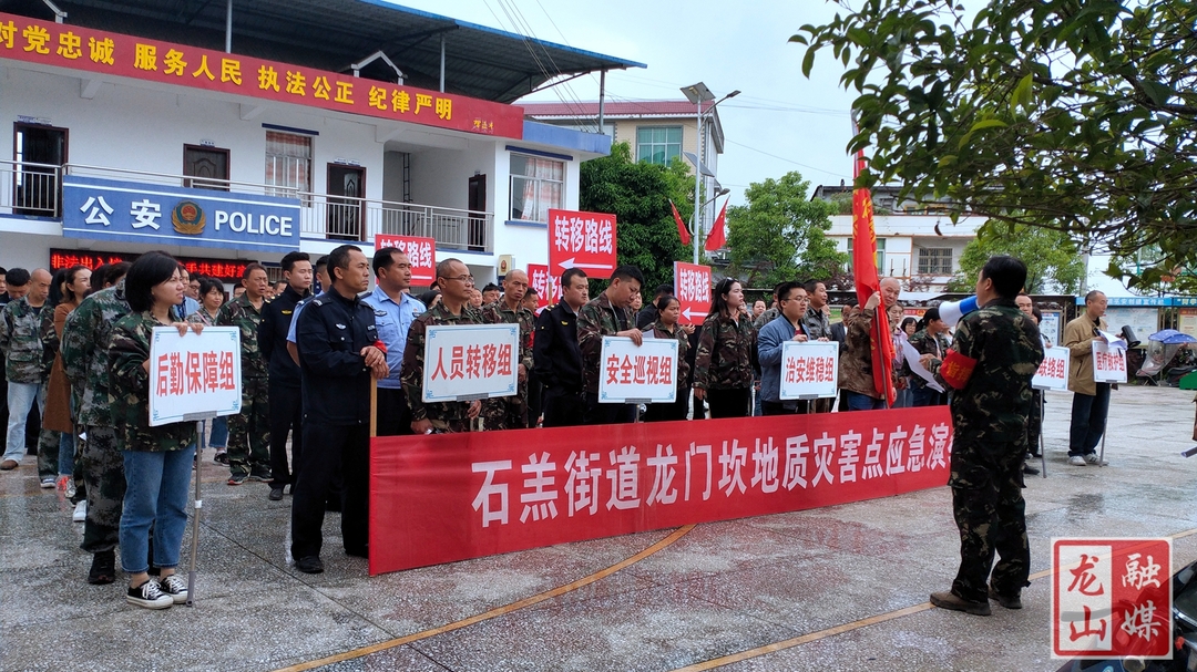 上午10时34分,“喂,石羔街道吗? 我是龙门坎地质灾害点监测员。向你们报告紧急情况,龙门坎靠石翔路路段有大面积地质滑坡迹象,险情严重,建议危险区群众紧急转移……”随着现场警报声、锣声、口哨声的响起,由石羔街道机关干部、应急民兵抢险队员、国土所、派出所干警、村辅警等组成的现场巡视组、人员转移组、现场搜救组、治安维稳组、医疗救护组、后勤保障组等6个工作组120余人,迅速集结,整装出发,跑步赶赴龙门坎地质滑坡地带现场,拉开了防汛避险应急实战演练的帷幕。