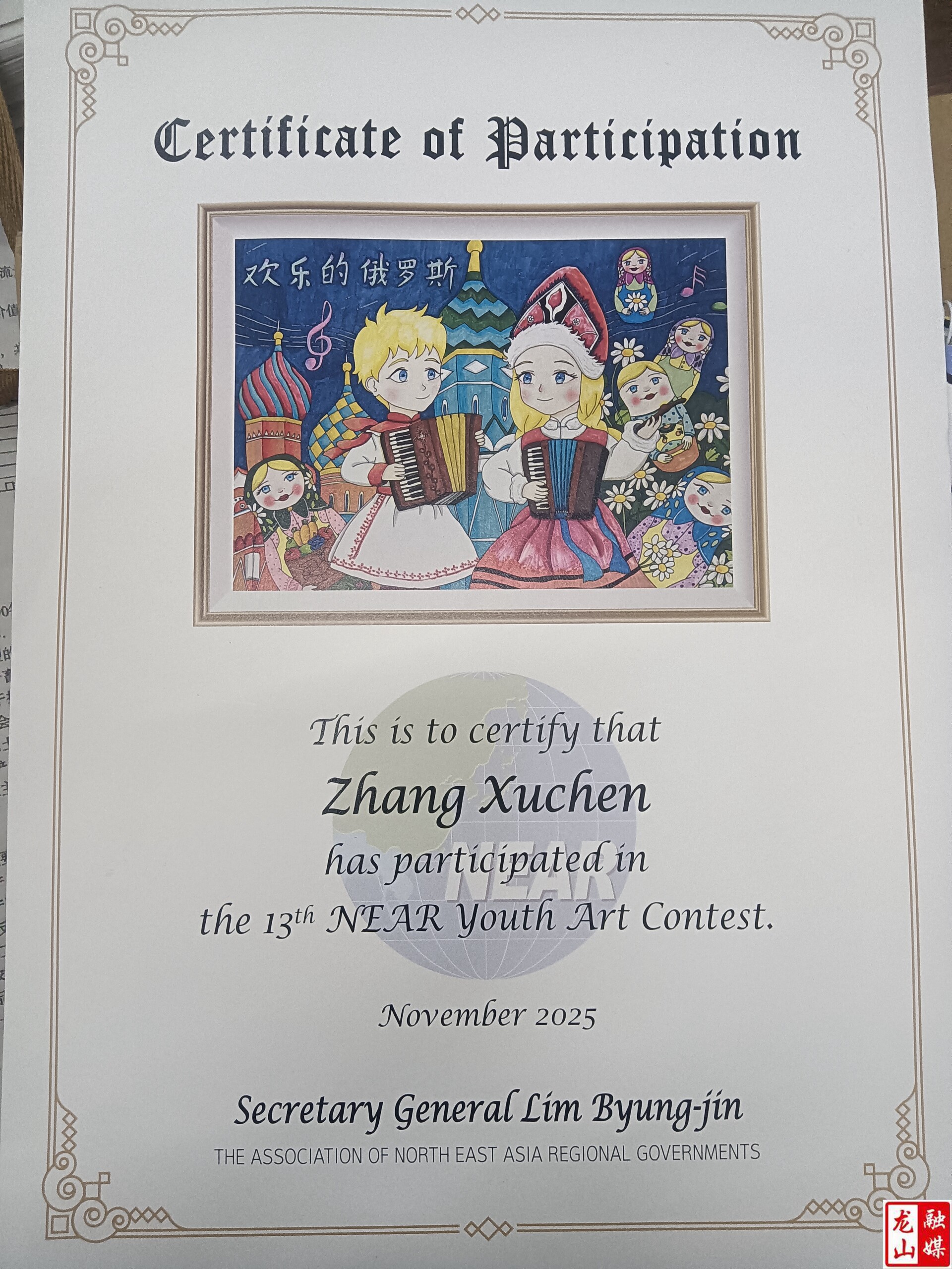 龙山县融媒体中心1月22日讯(通讯员 彭珍)1月21日,在县委办的组织下,县委外事办、县文联、县教体局相关工作人员来到县第二中学,为该校学生张旭辰颁发证书。在2025年举办的第十三届NEAR(东北亚)青少年绘画作品征集活动中,县第二中学张旭辰同学创作的美术作品《欢乐的俄罗斯》荣获组委会颁发的“入围奖”。