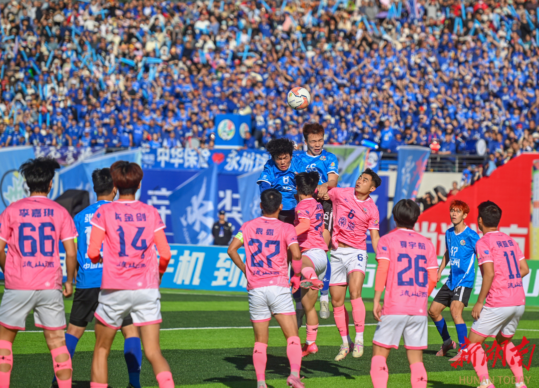 2025年11月29日,永州市体育场,永州队(蓝)球员与常德队球员在湘超联赛中激烈拼抢。湖南日报全媒体记者 郭立亮 摄