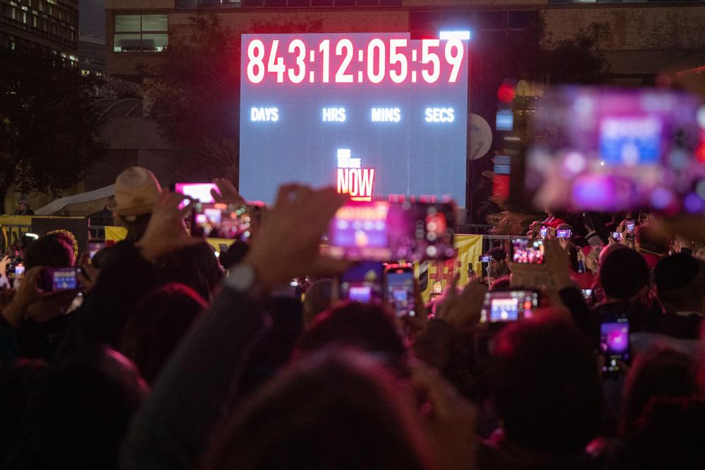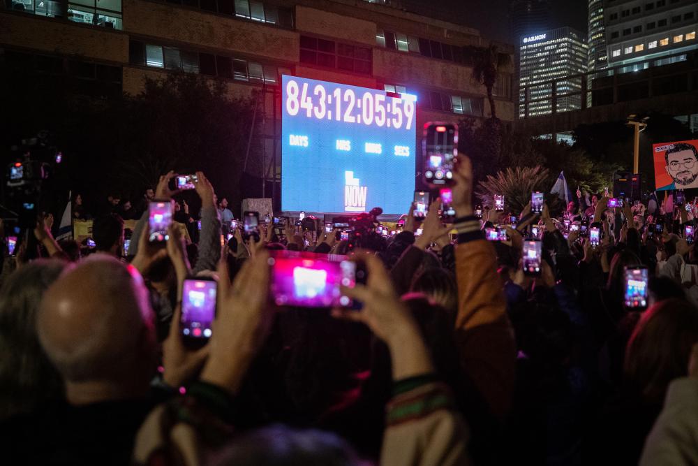 ↑↓1月27日,在以色列特拉维夫一处广场,人们用手机记录计时牌关闭过程。