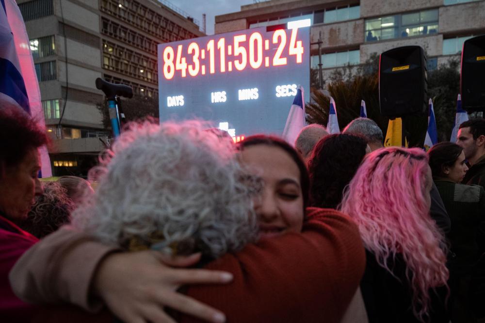 ↑1月27日,在以色列特拉维夫一处广场,人们参加计时牌关闭活动时拥抱。