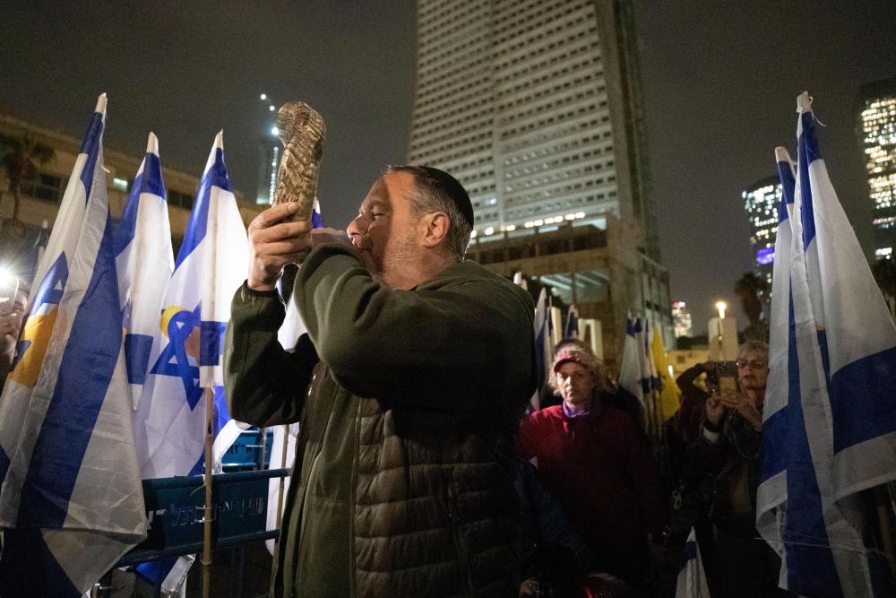 ↑1月27日,在以色列特拉维夫一处广场,人们参加计时牌关闭活动时吹响羊角号。