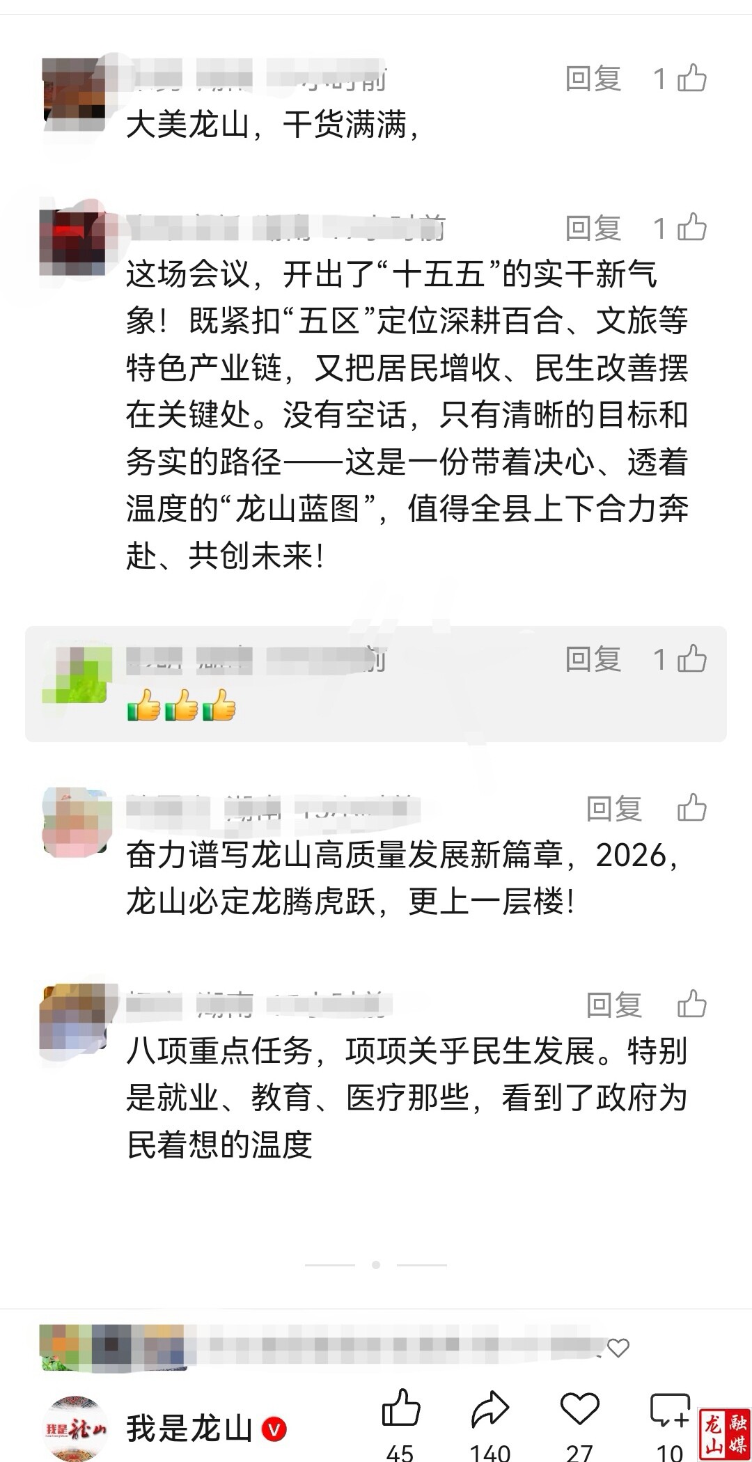 从充满期盼的“希望我们大龙山越来越好”,到信心满满的“2026,龙山必定龙腾虎跃,更上一层楼”,再到表达决心的“任务书、路线图都明确了,接下来就是铆足劲一起干”,各界热议汇聚成对龙山未来发展的一致看好与共同期盼。