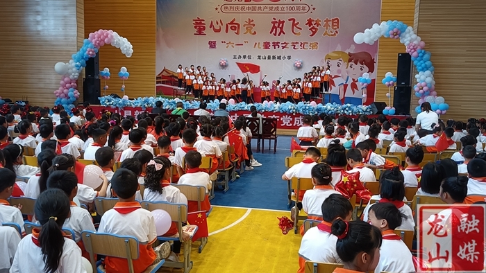 6月1日,在新城小学,师生们飞舞红旗,庆祝“六一”儿童节。一曲曲经典的红色歌曲,把现场的气氛推向了一个又一个高潮。
