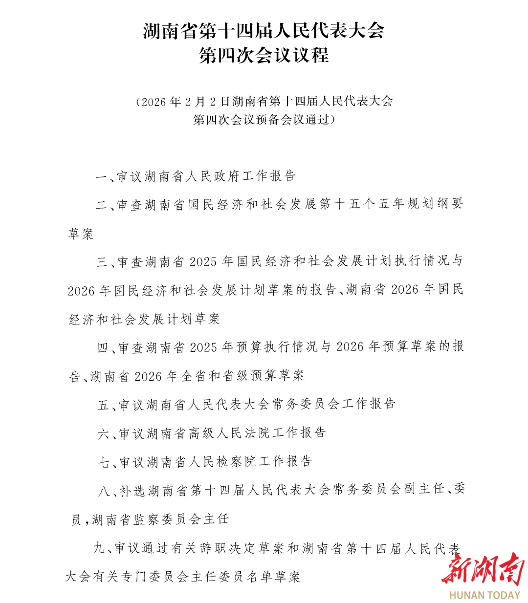 湖南日报·新湖南客户端2月2日讯(记者 郭宸)2日下午,省十四届人大四次会议预备会议通过了大会议程。具体如下:
