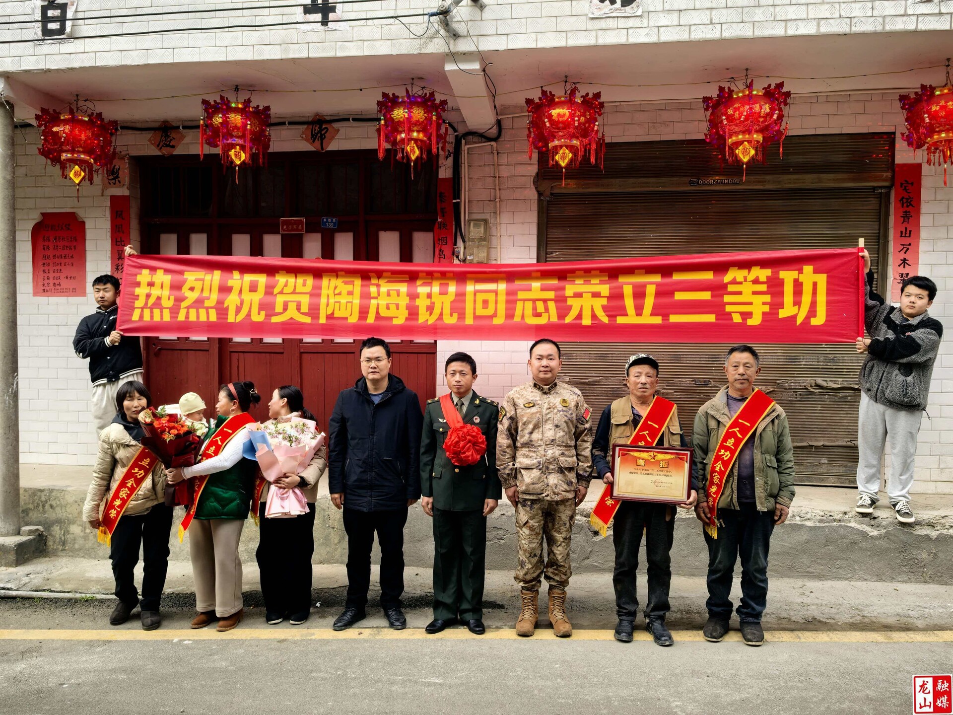 龙山县融媒体中心3月13日讯(通讯员 严京生 )锣鼓喧天庆功勋,喜报登门暖人心。近日,靛房镇人民政府、镇武装部等相关部门组成慰问组,为荣立个人三等功的现役军人陶海锐及家属送上立功喜报、鲜花与慰问品,让军人荣誉直达家门,让尊崇之风浸润乡邻。