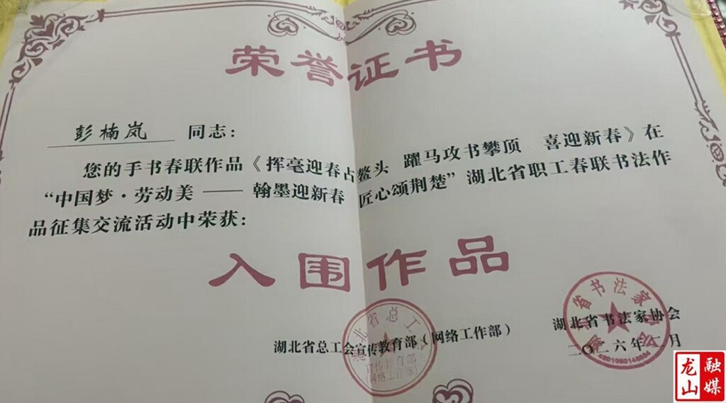 龙山县融媒体中心3月27日讯(通讯员 向利梅 田景攀 李万富)3月26日,县六小教师彭楠岚获得了湖北省总工会、湖北省书法家协会颁发的获奖证书,她创作的春联作品《挥毫迎春占鳌头 跃马攻书攀顶峰 喜迎新春》在“中国梦・劳动美——翰墨迎新春 匠心颂荆楚”湖北省职工春联书法作品征集交流活动中荣获“入围作品”。
