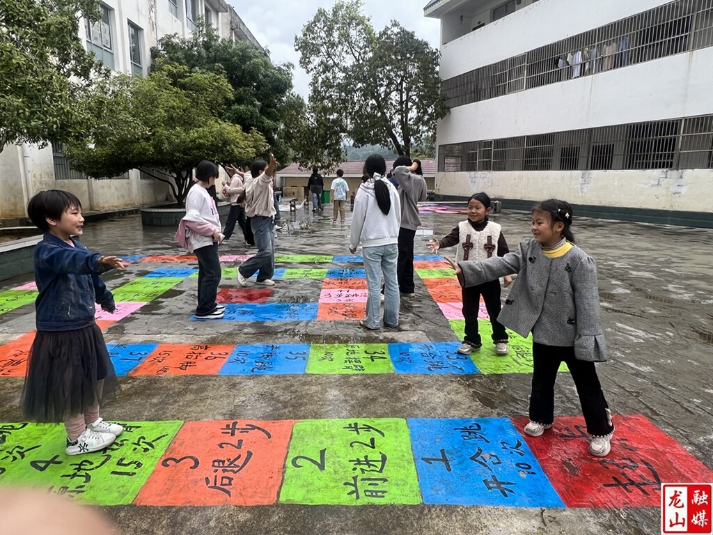 龙山县融媒体中心4月21日讯(通讯员 王泽英 唐翠翠 游茜)“前进2步!”“开合跳10次!”近日,湾塘九年制学校课间时光被一场场彩色地面游戏点亮。原本普通的水泥空地,被绘制成色彩斑斓的趣味闯关地图,红、蓝、绿相间的格子里,写满了充满童趣的游戏指令,成了孩子们课间最热门的打卡地。
